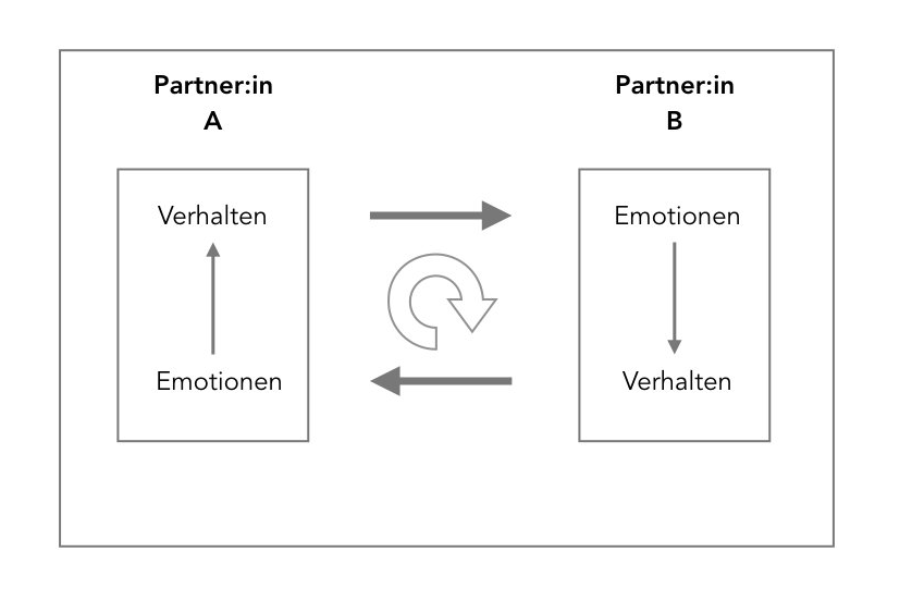 Als Paartherapeut fühle ich mich dabei weniger den Einzelpersonen als vielmehr dem Paar verpflichtet. Inhaltlich orientiere ich mich vor allem an emotionsfokussierten bzw. schematherapeutischen Ansätzen. Das bedeutet, es kann neben der lösungsorientierten Arbeit an Ihrer Kommunikation vor allem um die gemeinsame Aufklärung (auch unter biografischem Rückbezug) der den jeweiligen Verhaltensweisen der Partner:innen zugrunde liegenden Emotionen und der daraus entstehenden Wechselwirkung (siehe Schaubild) gehen. Neben dem Verständnis dieser Dynamiken ist es vor allem das Ziel, gemeinsame Schritte hin zu einer funktionalen Veränderung der Wechselwirkung zu erreichen. Wie tief wir an dieser Stelle auch biografisch einsteigen, entscheiden Sie.